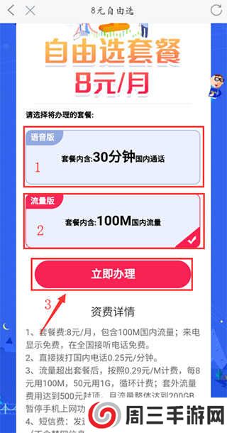 依据自身的要求,挑选如图所示1“语音版”,或是如图2“总流量版”,以后点一下3“马上申请办理”稍等片刻就可以。