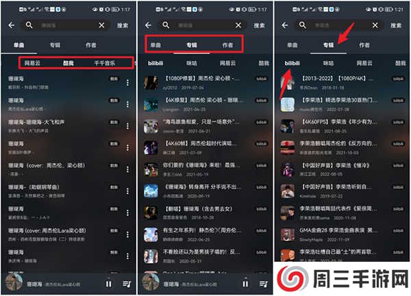 插件安装后,我们就可以直接搜索音乐了,可搜索音乐名或歌手名,支持的各个平台随意切换,针对那些讨厌的翻唱,大家可以选择“歌手--专辑”,按上图中所示点击播放即可。