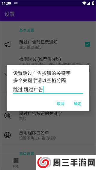 关键字。在应用中查找含有关键字的按钮,如果发现了对应的按钮,自动帮用户点击从而跳过广告。
