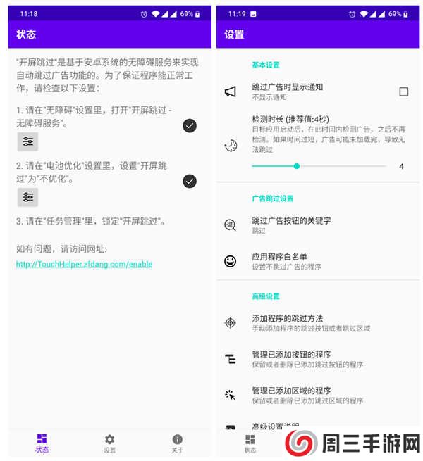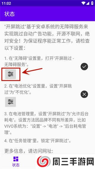 开屏跳过的首页已经提供了无障碍服务的设置方法,你只需点击图标,它会自动跳转到手机中相应的设置,直接在已下载应用中找到开屏跳过然后允许权限即可。