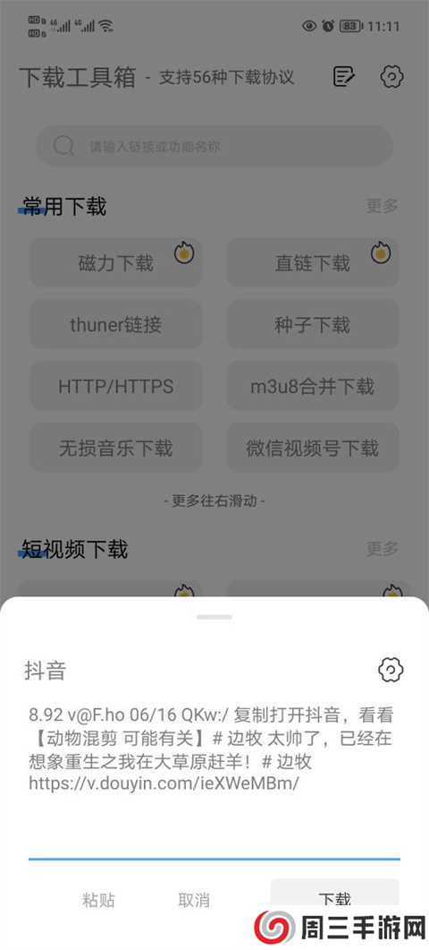 2、小编以抖音视频为例,将复制的抖音视频链接粘贴,点击下载。
