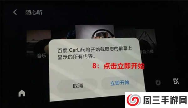 4、当数据线连接车机和手机后,打开车机里面的手机应用,手机里就会提示:百度 carline将截取尔屏幕上的全部内容,选择“不再提示”“立即开始”这时候你的手机屏幕就投射到车机中控屏上。其显示的内容和功能和原版并无差別。三方软件,比如优酷等,那么不要退出 carlie ex,让此软件进入后台,打开第三方app就可投屏第三方app内容。