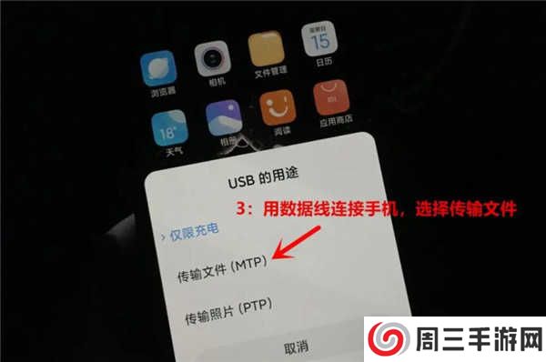3、数据线连接手机时,弹岀选项选择ˉ传输教据“切记