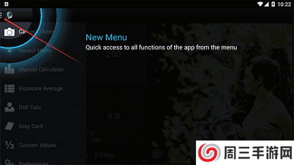 1、打开lightmeter,点击左上角的按钮可以唤出菜单栏,快速访问应用程序的所有功能;