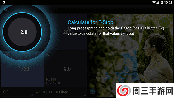 4、长按(按住)F-Stop(或ISO、Shutter、EV)值以计算该值,然后试用;