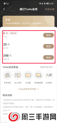 2.在续订Turbo会员界面选择好开通会员的时长然后点击购买选项;