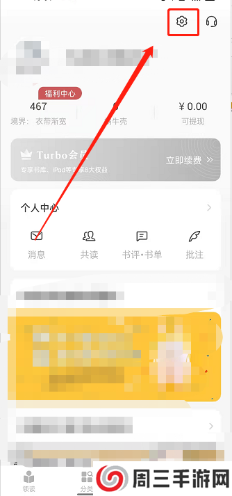 1、首先打开网易蜗牛读书软件,选择右上角的设置。