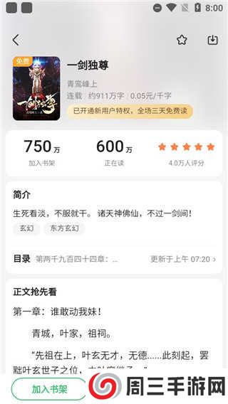 5、当我们点进去感兴趣的小说时,可以查看小说的简介,一目了然的看到其他读者对该小说的评分,可以免费试读。