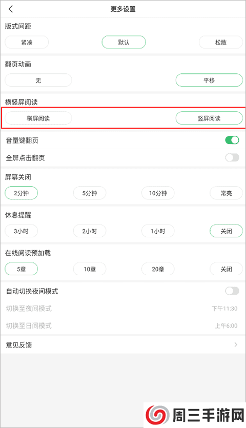 2、进入更多设置页面,在横竖屏阅读一栏选择“横屏阅读”就可以啦。