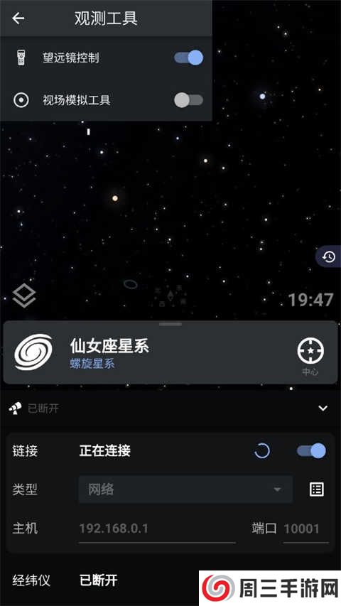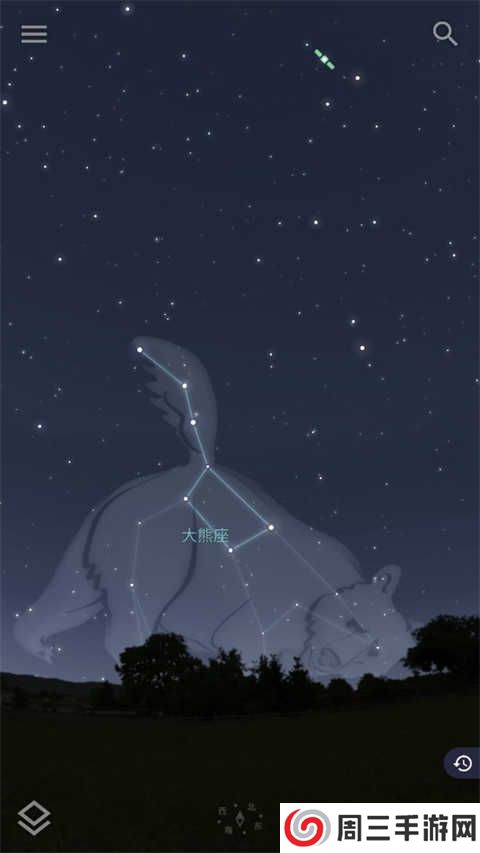 手机探测:打开之后,当上下左右移动手机时,会自动显示当前方位下的模拟星空。