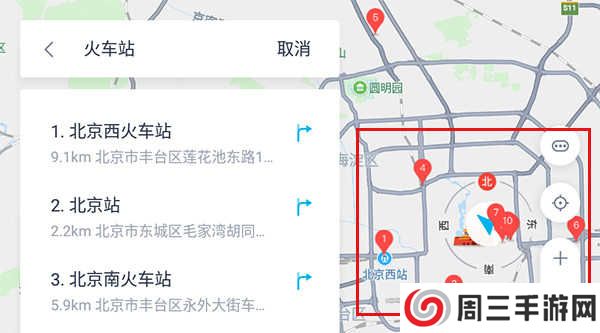 3、还可以选择美食、出行、景点、酒店等,输入火车站即可查看附近地区所有的火车站等;