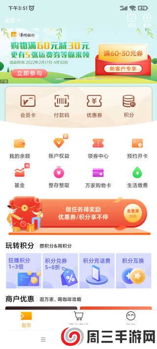 2、进入软件,在首页,有会员卡、付款码、优惠券、积分等,下方还可以查看余额、账户权益‘基金等;