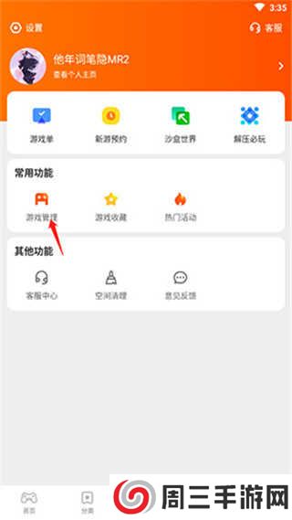 1、打开软件,点击底端的“我的”选项,然后点击“游戏管理”选项。Space