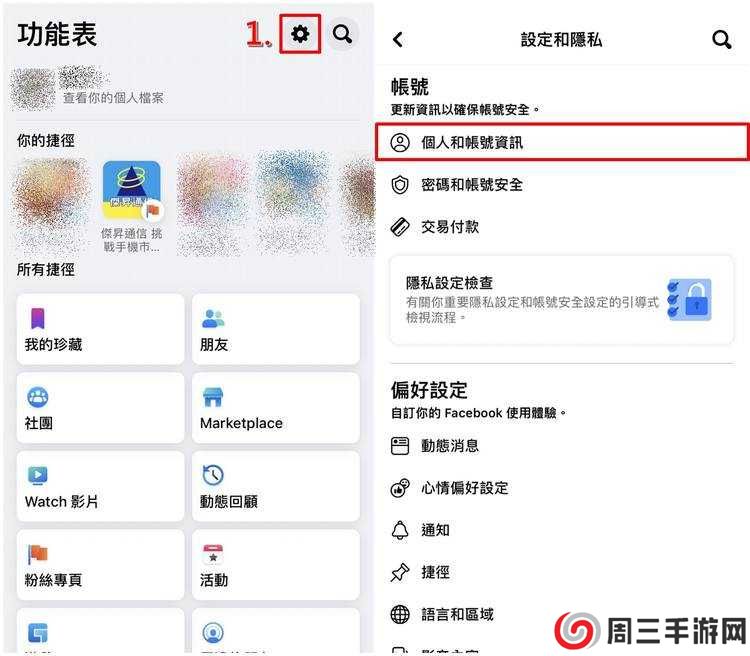 首先请打开手机的Facebook APP,点击右下方的「功能表」>「齿轮」,并按下「个人和帐号资讯」。