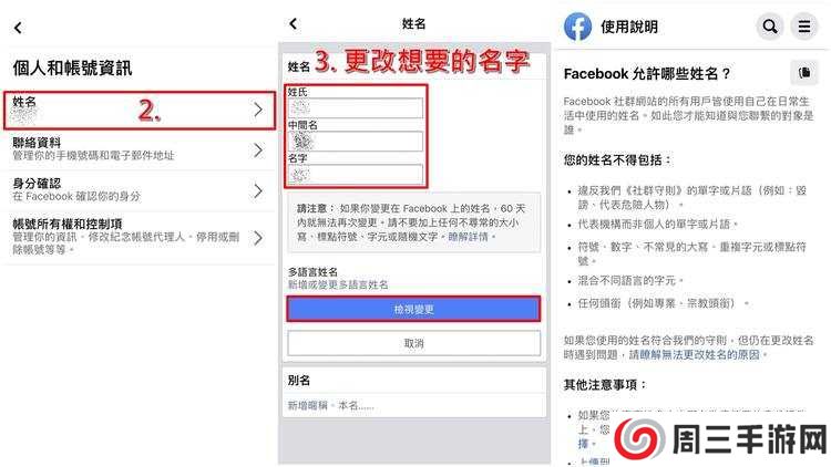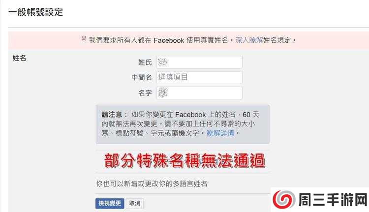 接下来选择「姓名」的项目,就能在此更改脸书帐号的名字了;而要注意的是,有些明显非真实名称的字眼,会被系统禁止。