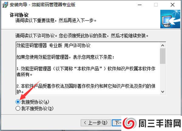 2、来到用户许可协议界面,选择“我接受协议”这一项,然后点击“下一步”。