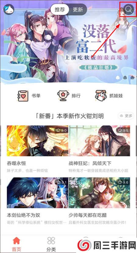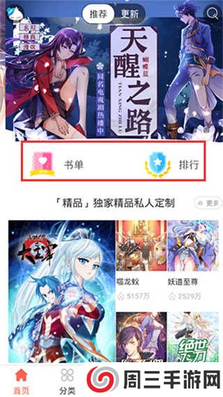 2、在首页,有书单、排行以及软件推荐的各种精品漫画;