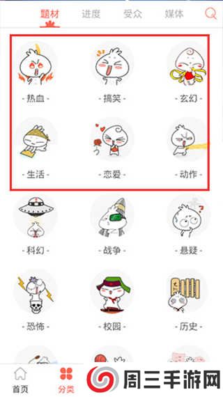 3、点开分类,有热血、高效、玄幻、生活、恋爱等多种题材的漫画;