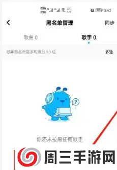 5、在弹出“黑名单管理”界面,选择下方“添加想屏蔽的歌手”就可以了。