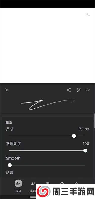 4、在此页面找到SMOOTH字样,它就是画笔平滑度的设置比例,设置在30%-50%左右就差不多了,太高了效果反而不好,设置好之后点击右上角的勾即可。