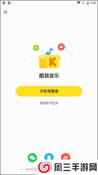 2、进入到登录界面之后,一共有四种登陆方式,分别是QQ、新浪微博、微信和酷我账号方式,如果确实还没有以上的账号,还可以点击下方的“注册”选项进行,用户还可以在这里选择上次登录的账号,非常方便,
