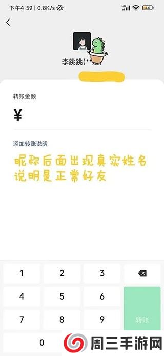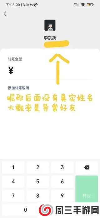 如果好友昵称后面没有出现真实姓名,则需要我们进行“假转账”,进一步确认与好友之间的关系。