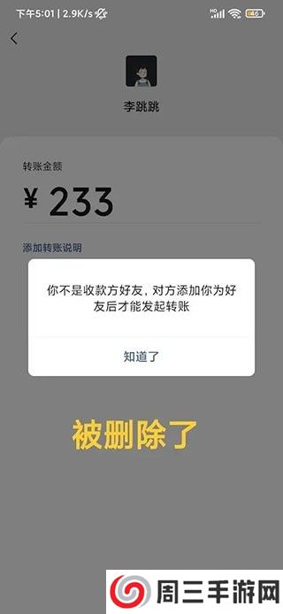 5、对方添加你为好友后才能发起转账”则说明我们被删除了,会有提示请确认功能。