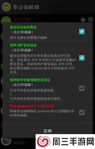 稍等一会,出来四个选项,我们勾上头两个绿的(签名验证始终真实、禁用 ZIP 签名验证),按“应用”。然后大概有个提示,点“确定”,会重启手机。重启后可能自动优化什么的,耐心等待;