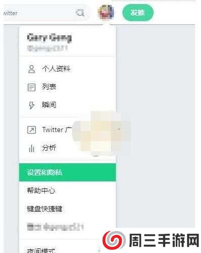 1、首先进入推特(twitter)账户点击顶部的用户头像,选择设置和隐私(Settings and privacy);