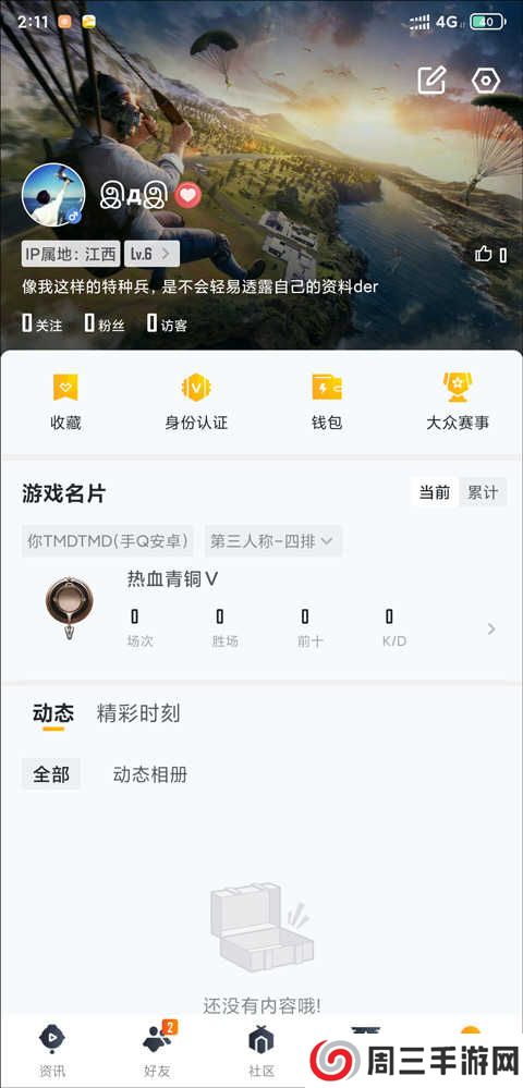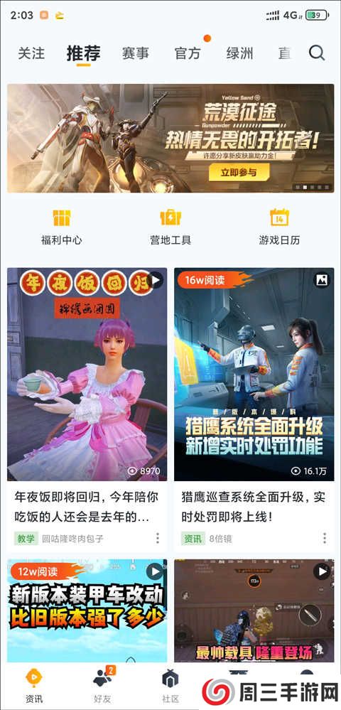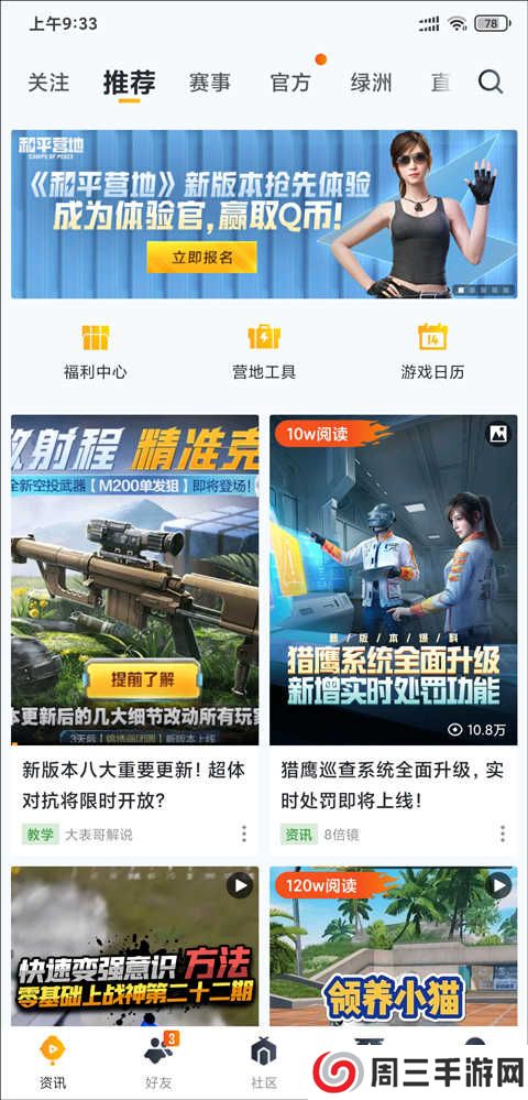 3、和平营地是和平精英官方的社区app,这里集资讯攻略,玩家动态以及游戏资料等内容为一体,能够让你随时随地查看游戏的最新动态,独家攻略让你更好掌握游戏技巧,取得胜利,还可以查看附近战友人的动态,实时寻找游戏搭档,组队开黑,还可以为你保存游戏精彩时刻,让你更好的享受游戏
