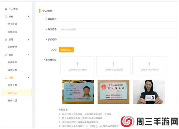 7、注意填写的信息都是要真实的,而且还需要上传自己的身份证,除了内容作者以外,其他认证都需要证明的。