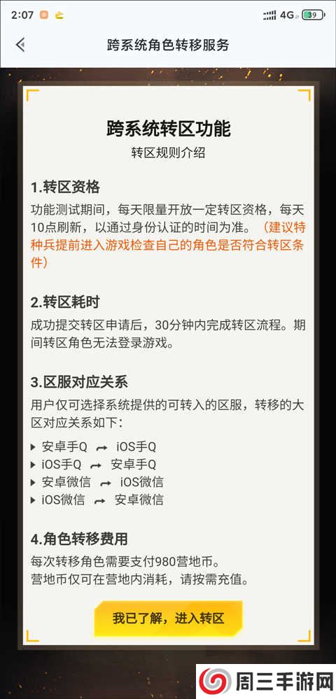 4、进入到系统转移流程,仔细阅读系统角色转移服务,然后点击“我已了解,进入转区”按钮