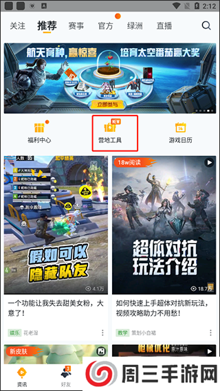 2、在资讯中找到营地工具,打开,进入游戏工具界面