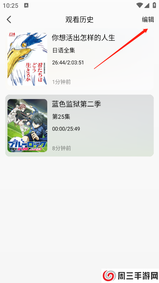 2.就可以看到全部的观看历史了,接着点击右上角的“编辑”。