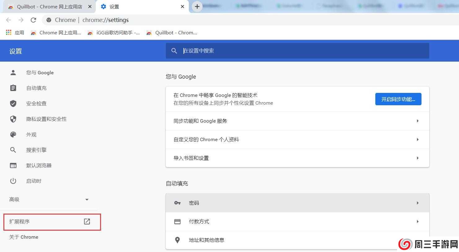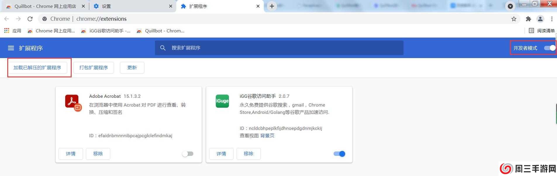 2.打开浏览器扩展程序选项,选择已解压的扩展程序