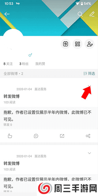 3、然后找到不想让他人看的微博,并点击旁边的下拉箭头