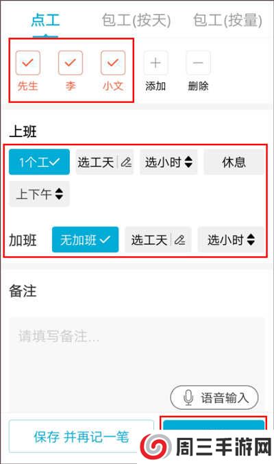 (5)再选择需要记工的工人、工人的上班时长、加班时长,点击[保存]即可批量记工