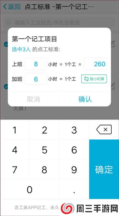 2、设置上班标准(多久时长算1个工)、每个工多少钱,选择加班标准,可选择按工天算(加班多久算1个工)、按小时算(时薪),点击【确定设置】。