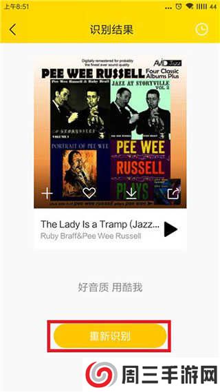 6、听歌识曲在唱歌的时候一定要在安静的环境中,而且要对准麦克风的位置唱歌,这样识别的结果更准确,识别后会出现识别结果,当然,识别的过程很可能是错的,这时点击【重新识别】再识别一次。