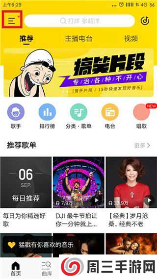 1、打开进入到酷我音乐,在酷我音乐推荐界面中点击左上角的【三】按钮。