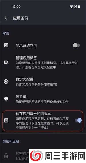 在应用备份设置中,有一项「保存应用备份的旧版本」功能,勾选后将实现如果应用更新,那么你可以随时恢复该应用到备份时的旧版本,非常方便。