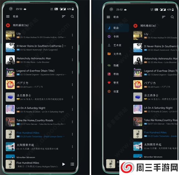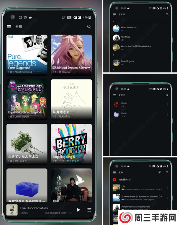 2.打开应用你就能看到你的歌曲,不会有任何多余的操做,除了开屏歌单以外,你可以选择开屏以专辑,以艺术家,还有文件夹的方式呈现在你的眼前,在歌曲list界面还会显示歌曲的一些信息,例如歌曲的品质,如果你的歌曲是高解析度音频,会出现Hi-Res小金标