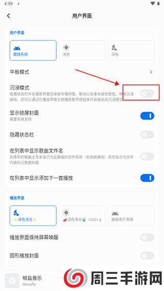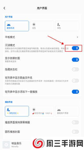 在用户界面设置中,找到沉浸模式,点击后面的开关按钮,如图所示: