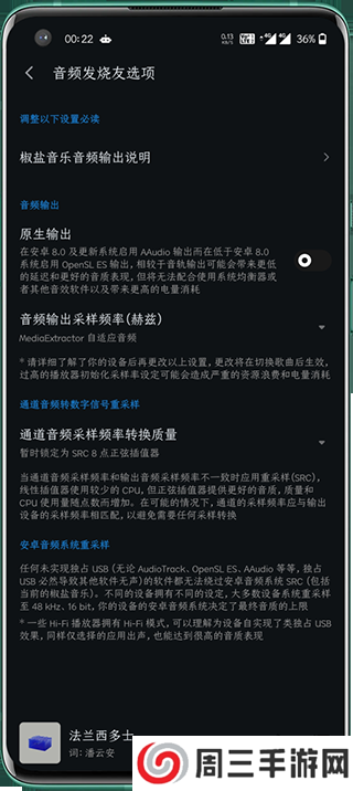 5.除此之外,在设置里有一项【音频发烧友选项】,一听名字就知道是为音乐发烧友准备的,里面包含了音频输出,采样频率等。