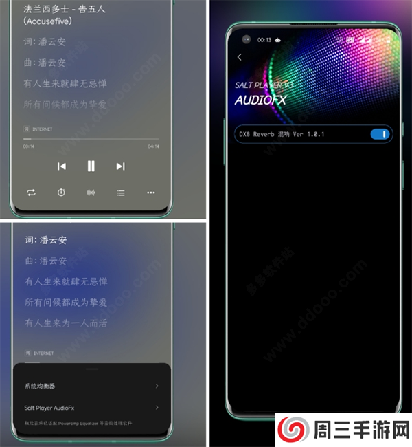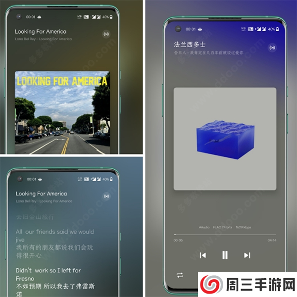 3.再来看看听歌界面,歌曲界面由两部分组成,一面是专辑封面一面是歌词,这两面让你在听歌时不会觉得很单调。在专辑那一面会显示歌曲的格式类型和码率,对于音乐发烧友来说这项功能还是很特殊的。歌曲播放时的界面为,高斯模糊的流光,可以在设置里设置流光的效果,例如主题和流光效果的强弱。