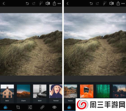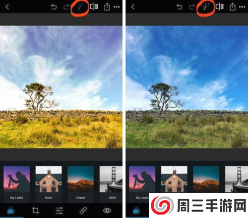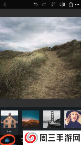 滤镜在PhotoshopExpress应用程序中称为“外观”。要访问过滤器,请点按屏幕左下角的查看图标(三个重叠的圆圈)
