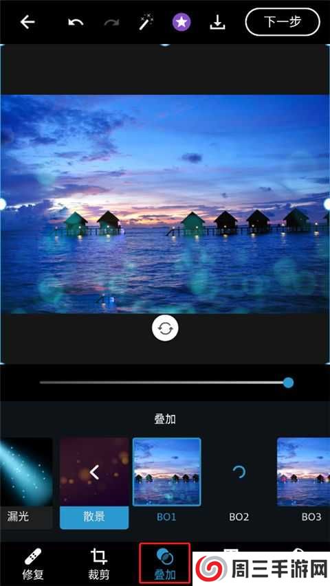 10.点击效果图标,就可以给图片添加一下氛围,如漏光、杂色等效果,也可应用创意纹理和叠加效果,让简单的图像瞬间变得灵动而独具特色;
