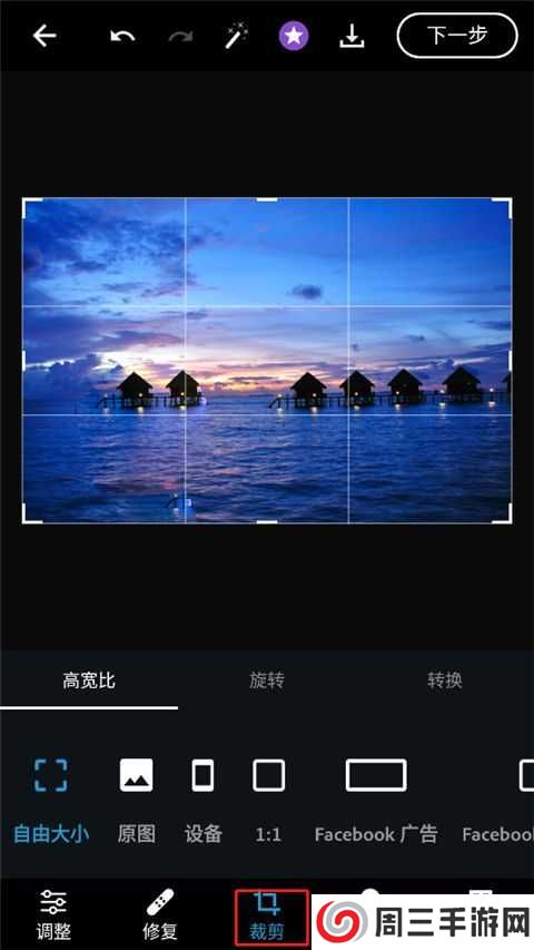 9.点击第4个剪裁图标,用户可以裁切、修齐、旋转和翻转照片。此功能帮助用户按照任何社交媒体平台的要求,选择照片的宽高比或自定义照片大小;