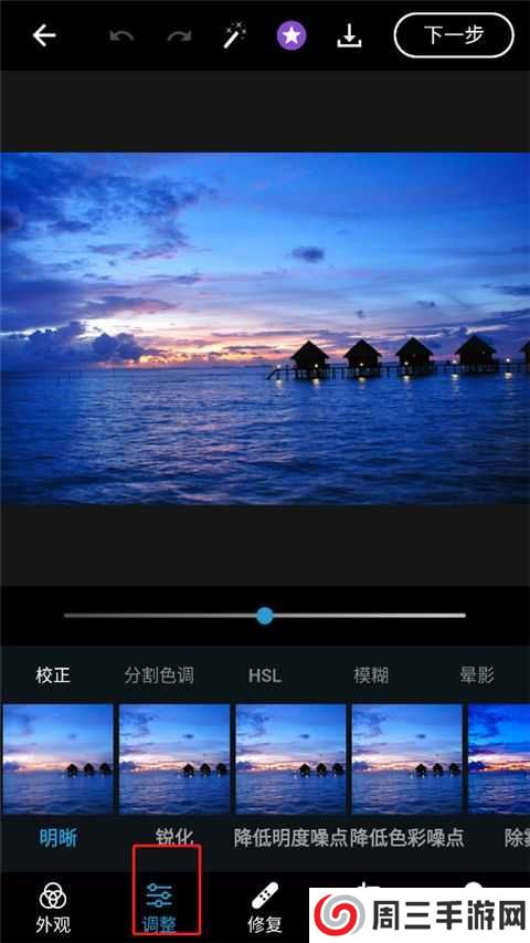 进入工具栏的第三个调整工具中(正常步骤是先对图片旋转裁剪,然后添加滤镜后再做这一步)。