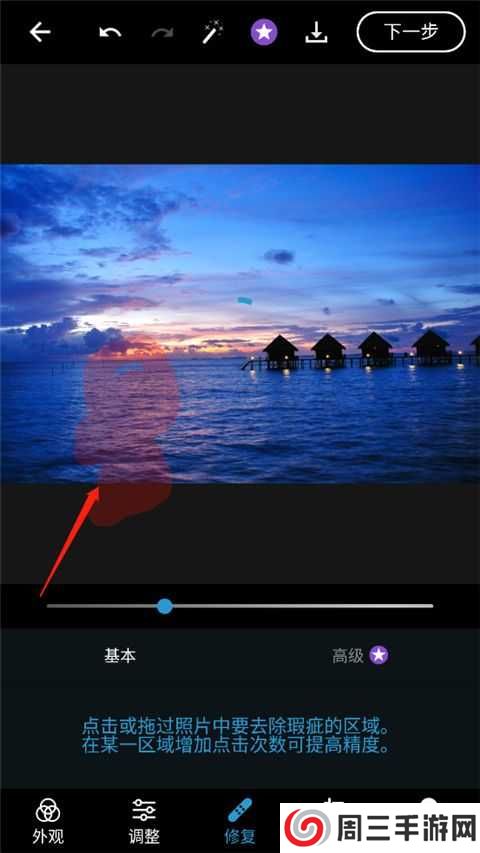 7.点击第三个修复图标,可以局部修补或者替换图片了,使用手指涂抹需要替换的部位,接着我们就可以看到涂抹的地方变为了红色;